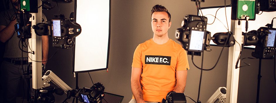 Die Aufsetzung wirkt, als sei sie einem futuristischen Film entsprungen. Es dauert etwa drei Stunden, um einen kleinen Bereich aufzusetzen, der vorsichtig mithilfe von Kameras mit sechs- bis achtfacher Bildauflösung abgebildet wird. Der Spieler, in diesem Fall Mario Götze, sitzt dann in einem drehbaren Stuhl in der Mitte des Raums, während wir Hunderte von Bildern zeitgleich aufnehmen.
