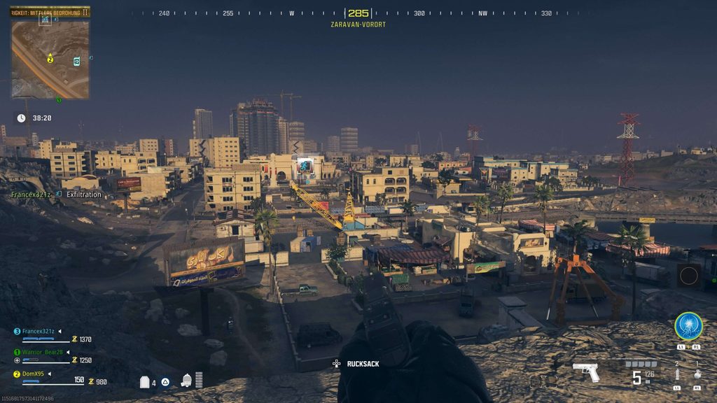 Auf der Karte werden mehrere dieser Punkte angezeigt, an denen ihr exfiltrieren könnt. Dort landet zu bestimmten Zeiten ein Helikopter, der euch aus der Gefahrenzone bringt. Begebt euch am besten zu einem Exfill, der sich im äußeren Ring befindet. Dort ist es logischerweise viel einfacher, erfolgreich zu entfliehen.