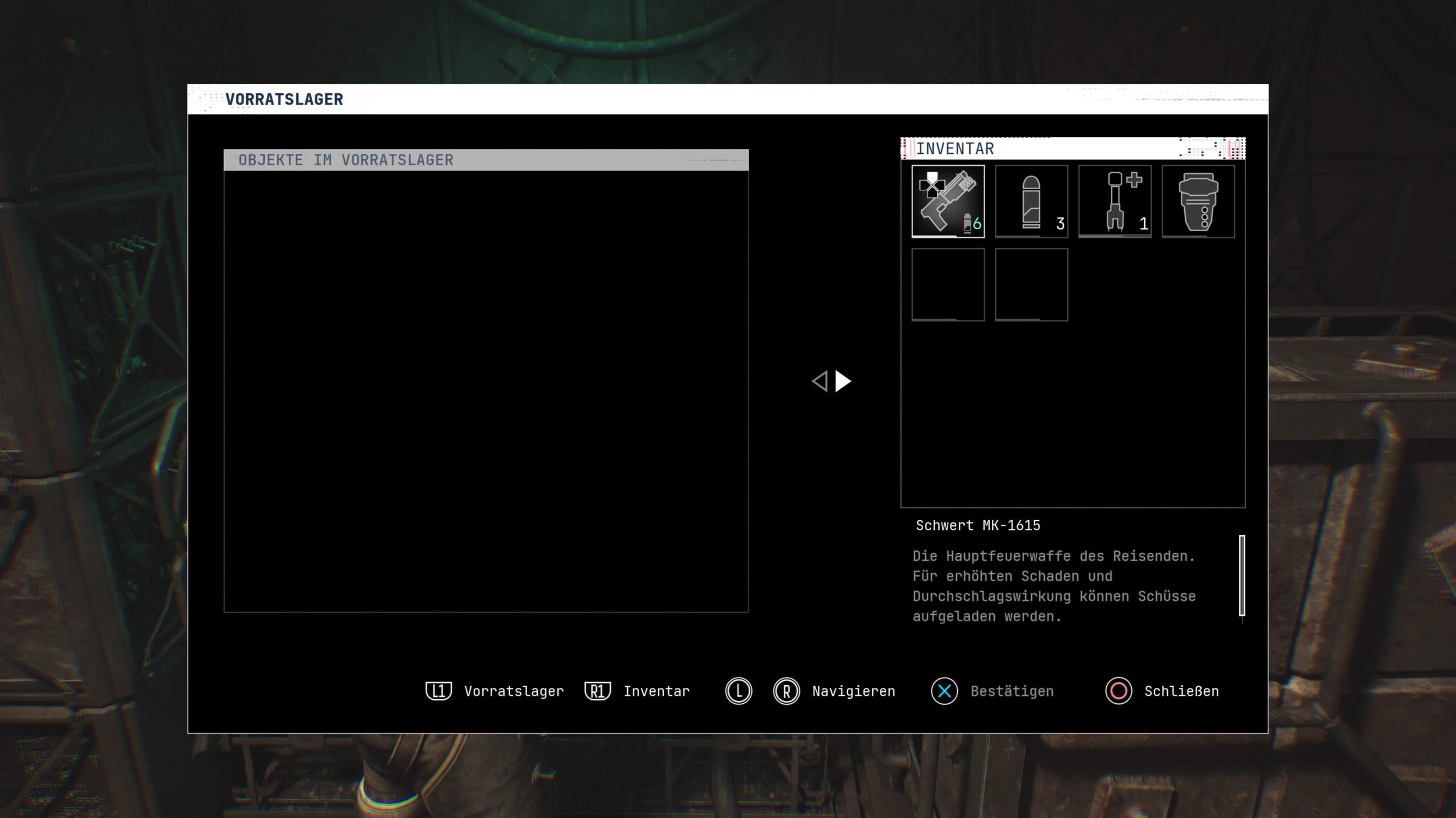 Wie in so vielen Spielen gibt es Werkbanken, an denen ihr eure Ausrüstungsteile verbessern könnt. Außerdem habt ihr die Möglichkeit, Items zu kaufen und zu verkaufen. Und dann wäre da noch das Vorratslager, um momentan nicht benötigte Gegenstände zu bunkern.